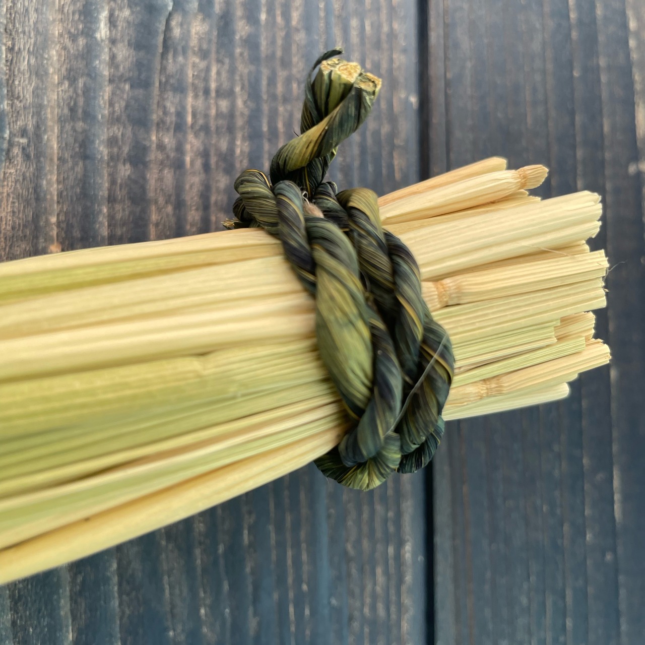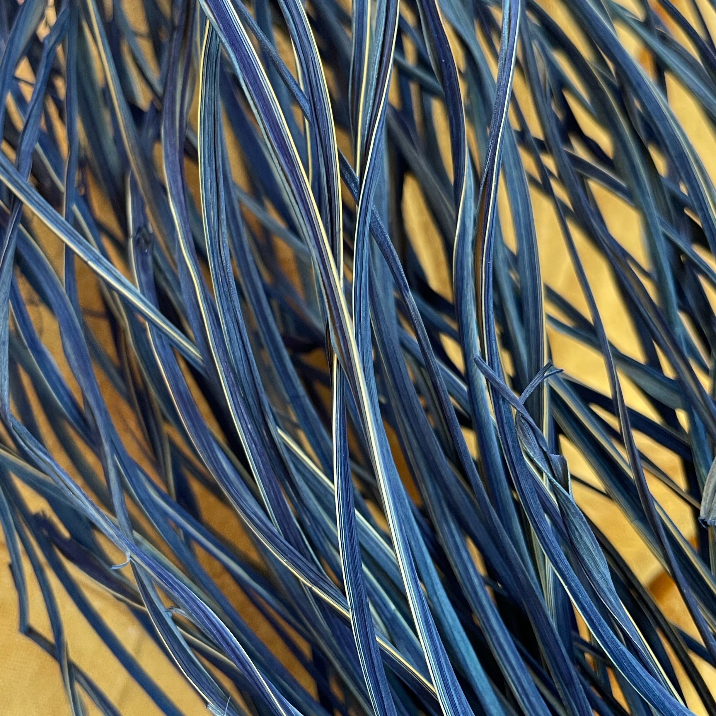 元側の紐と吊り紐は、稲藁を藍染めして縄に綯ったもの。